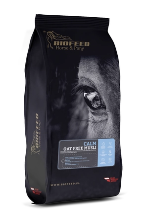 BIOFEED Calm Oat Free Musli to aromatyczna strukturalna mieszanka paszowa dla koni nerwowych, nadreaktywnych i podatnych na stres. Dzięki naturalnym składnikom uspokajającym, wysokiej strawności i braku owsa, wspiera skupienie w pracy i równowagę emocjonalną, bez utraty energii.