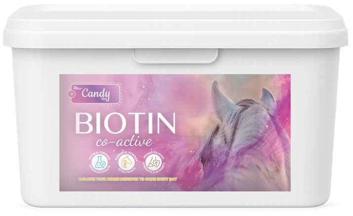- Candy Biotin Co-Active to zaawansowana mieszanka paszowa uzupełniająca dla koni i kuców, stworzona z myślą o zwierzętach z problemami dotyczącymi kopyt, skóry i sierści.