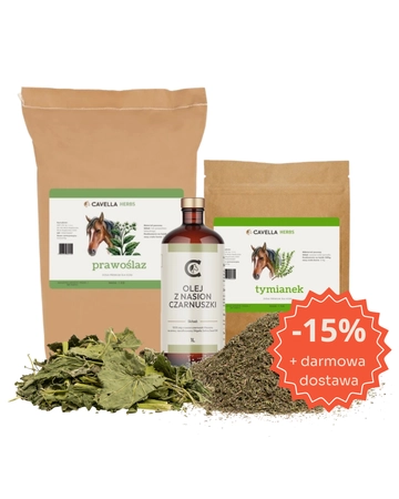 Zestaw “spokojny oddech” olej z czarnuszki, prawoślaz ziele, tymianek. Poznaj moc tymianku, prawoślazu oraz czarnuszki i zapewnij swojemu kopytnemu swobodny i lekki oddech. Zawarty w oleju z czarnuszki tymochinon działa przeciwalergicznie, immunomodulująco oraz przeciwzapalnie. Połączenie tymianku oraz prawoślazu będzie działało osłonowo i nawilżająco na śluzówkę układu oddechowego. Zestaw wspomoże rozrzedzenie wydzieliny i usunięcie jej z dróg oddechowych dzięki składnikom o działaniu wykrztuśnym. Tymianek dodatkowo działa antybakteryjnie i przeciwgrzybiczo.