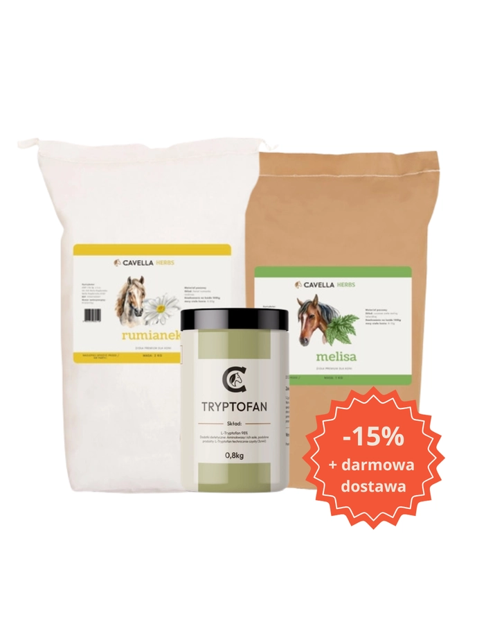 Zestaw “spokojny koń” rumianek, melisa, tryptofan. Wesprzyj swojego konia w stresowych sytuacjach tj. Sylwester, zmiana stajni, wyjazd. Połączenie rumianku oraz melisy pozwoli zmniejszyć napięcie nerwowe, będzie działać uspokajająco i odprężająco. Rumianek dodatkowo regeneruje błonę śluzową przewodu pokarmowego, działa rozkurczowo i osłonowo dzięki czemu zmniejszy negatywne skutki stresu. Olejki eteryczne zawarte w melisie oddziałują na receptory GABA, dzięki czemu wyciszają i zmniejszają napięcie. Tryptofan jest prekursorem serotoniny, wspomaga utrzymanie dobrego samopoczucia, wspomaga funkcjonowanie koni nadpobudliwych oraz stresujących się, pomaga się wyciszyć. Pamiętaj! Mieszankę należy podawać przez co najmniej 2-3 tygodnie przed stresującą sytuacją.