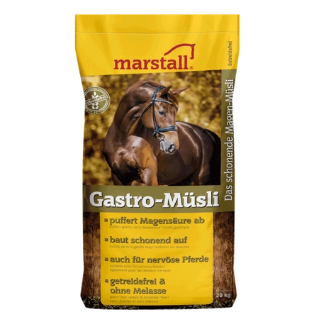 Marstall Gastro-Müsli to specjalistyczna pasza w formie miękkiego musli, stworzona z myślą o koniach cierpiących na wrzody żołądka i jelit. Dzięki łagodnej strukturze, bezzbożowej formule i niskiej zawartości cukrów i skrobi, zapewnia komfort trawienny, wspiera regenerację błony śluzowej oraz pomaga utrzymać zdrowie układu pokarmowego nawet u najbardziej wymagających koni.